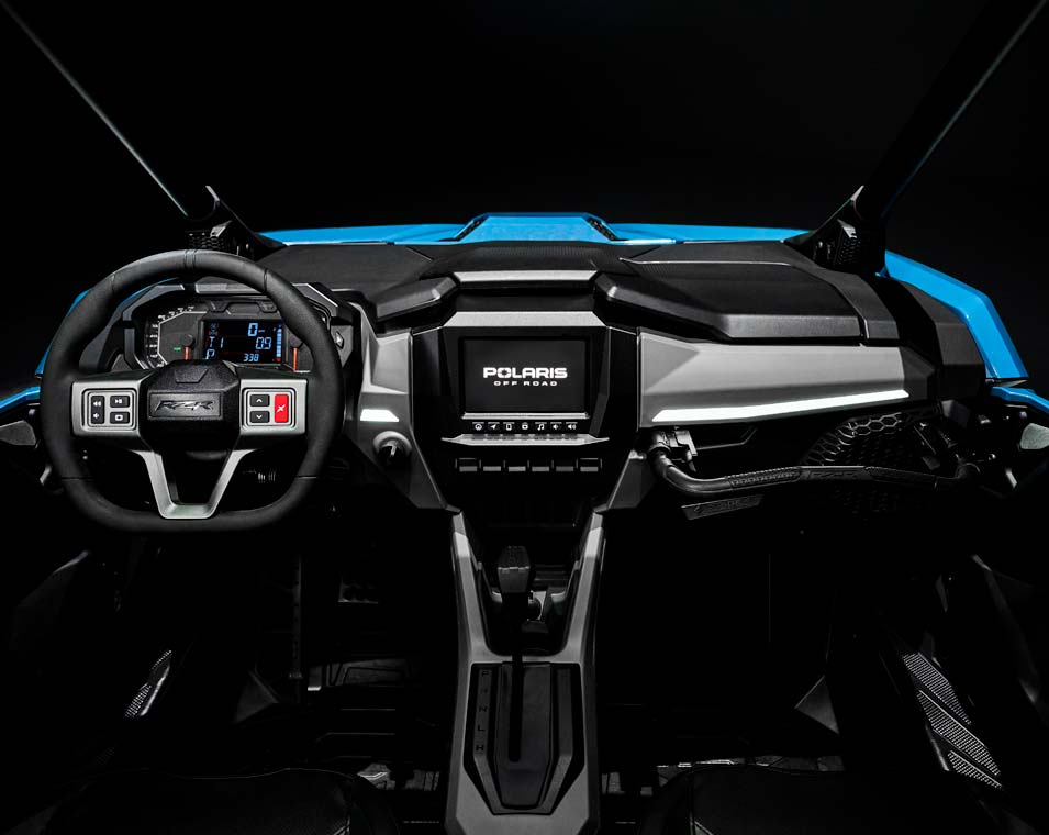 « Écran RIDE COMMANDMD de 7 po avec touche tactile résistif : Visualiseur DYNAMIX 2.0, GPS intégré, conduite en groupe (par téléphone cellulaire ou GPS), cartographie topographique, connectivité Bluetooth et USB pour téléphone intelligent, radio AM/FM et météo (haut-parleurs requis - vendus séparément), communications à bord du véhicule possibles avec casques d'écoute Sena en option, système antivol P.A.S.S. de Polaris. Cadrans analogiques à double balayage avec centre d'information du pilote à écran LCD de 4'' : Rétro-éclairage et luminosité bleu/rouge sélectionnables par l'utilisateur, intervalles d'entretien programmables. Instrumentation numérique : Indicateur de vitesse, tachymètre, compteur kilométrique, totalisateur partiel, horloge, compteur d'heures, indicateur de vitesse, jauge de carburant, température du liquide de refroidissement, voltmètre, indicateur et codes d'entretien, témoin de rappel de ceinture de sécurité, indicateur de vitesse, prise de courant continu.